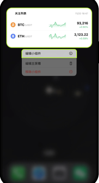 温馨提示:您可以在“关注列表”小组件里长按更改您关注的币种,操作路径如下: 先添加“关注列表”小组件到主屏幕,然后长按关注列表,点击【编辑小组件】。