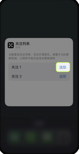 3、点击已经添加的欧易小组件,点击【选取】—搜索或者下拉找到您想添加到关注列表的币种完成操作。
