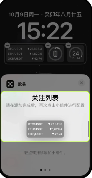 您可以在锁屏页面添加欧易盯盘小组件;要注意的是:您需要在iOS 16或更高版本上进行设置。