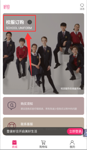 1、商城首页,三大板块:校服专区,购买须知,客服支持。