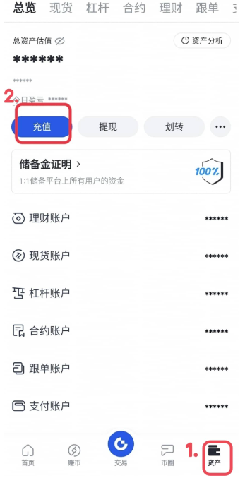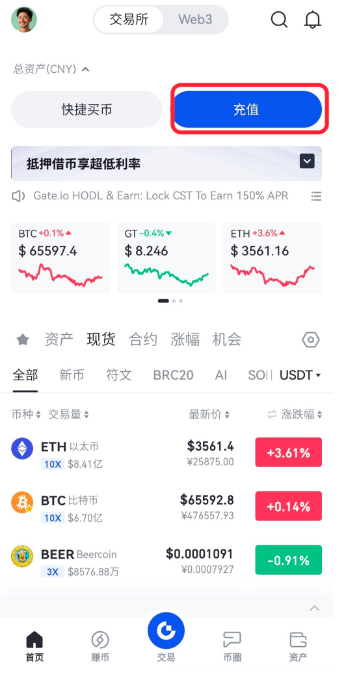 步骤一:在Gate.io App登录账号,然后点击主页中的“充值”,或者点击“资产”-“充值”。