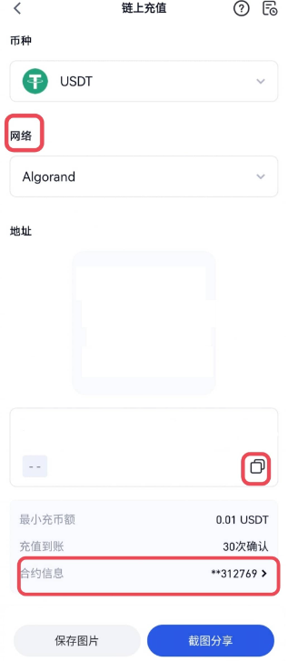 注意:所选择的充值网络必须与提现过来的钱包/平台所选择网络一致,以及合约地址相同,否则不能够到账。