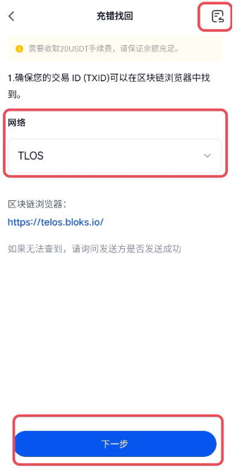 步骤四:选择好充值使用的网络后,点击“下一步”。在此界面,点击右上角的“笔记本”标志,可以看到历史申请记录和状态详情。