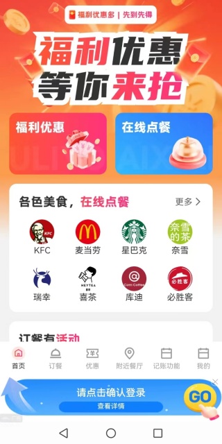 2、进入软件首页,支持用户在线点餐,包含KFC、麦当劳等知名品牌及地方特色餐厅。