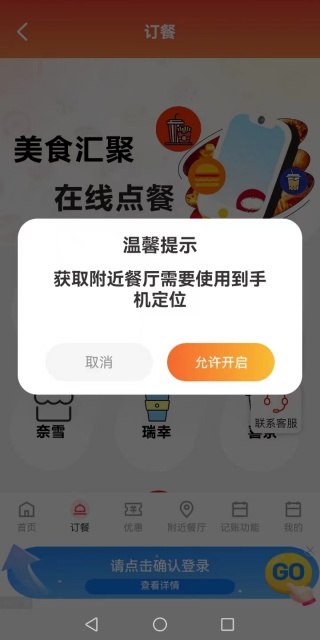 3、订餐板块,用户需开通软件的地址权限,然后就可以查看附件餐厅,并订餐。