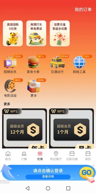 4、优惠板块,汇聚多种优惠,涵盖视频会员、美食卡券、交通出行等优惠信息。