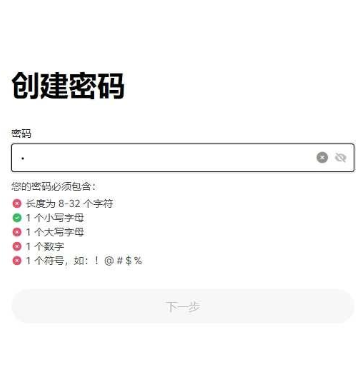 4、创建密码需要符合长度为 8-32 个字符、1 个小写字母、1 个大写字母、1 个数字、1 个符号,如:!@ # $ %等条件