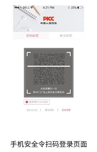 步骤二:打开已安装的手机安全令APP,在手机APP打开首页面, 选择扫码绑定,点击页面中间的扫一扫功能,通过扫描步骤一中电脑端页面弹出的安全令绑定码,实现手机安全令绑定激活。