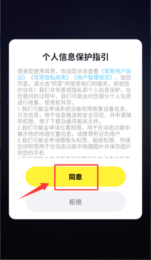 1、启动耳旁应用,确认个人信息保护指引后进入登录界面。