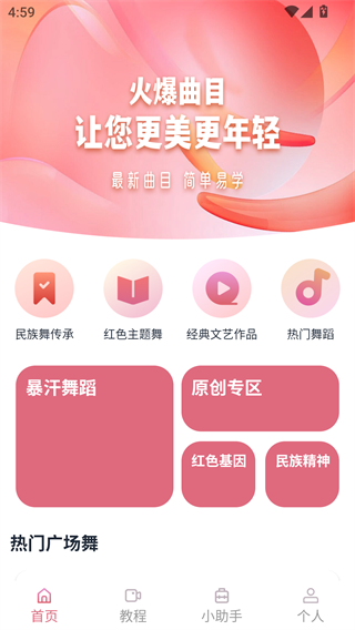 2、首页可以看到民族舞、红色主题舞等不同的舞蹈类型分类的入口;