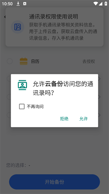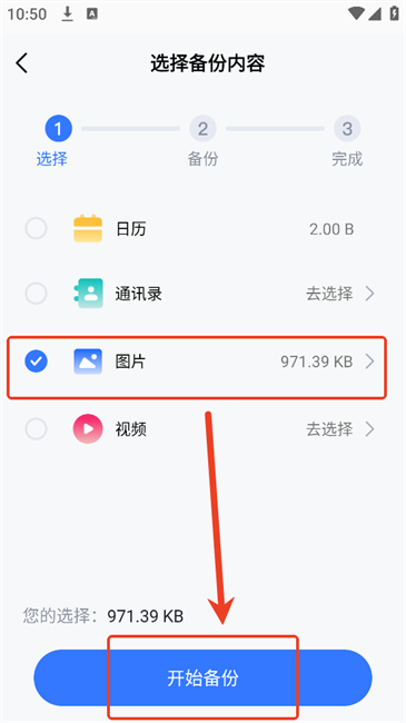 3.授权后选择需要同步的内容后点击“开始备份”