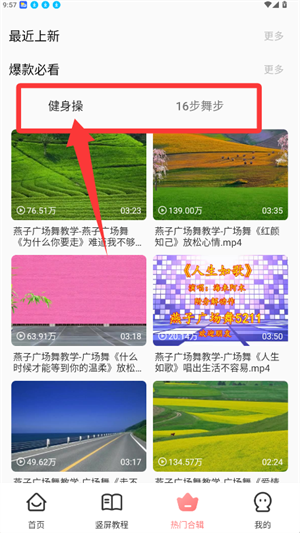 2、在热门合辑选择健身操,浏览广场舞教学视频。