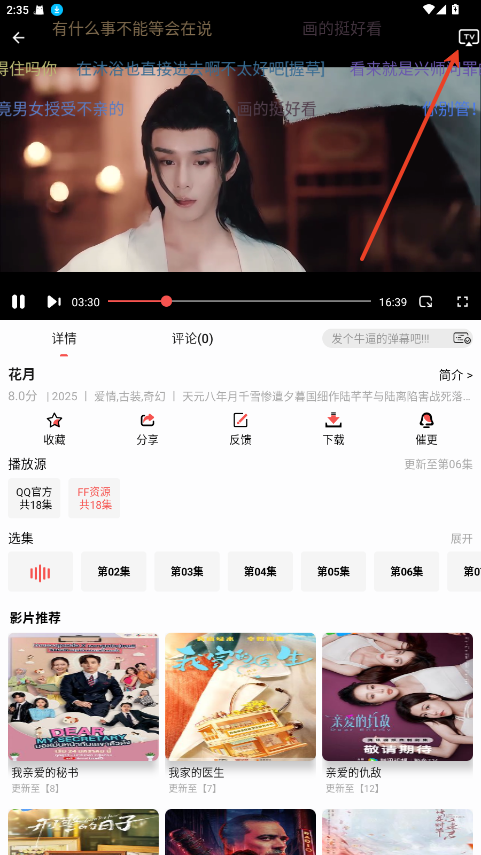 2、接着在播放页面点击右上角TV投屏