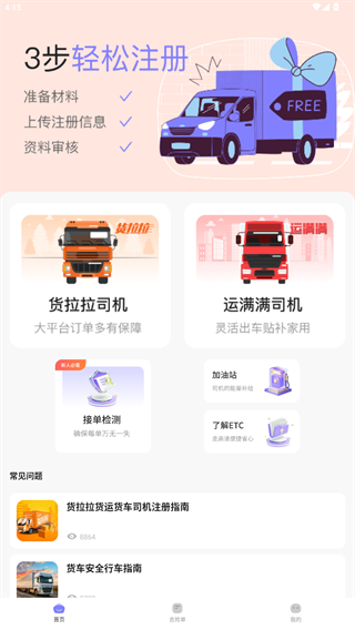 3、在软件首页会有司机注册详细流程,3步快速注册。