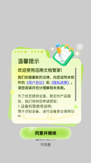 首次打开应用时,会出现用户协议页面,只有点击“同意”按钮,才能继续进行后续操作。