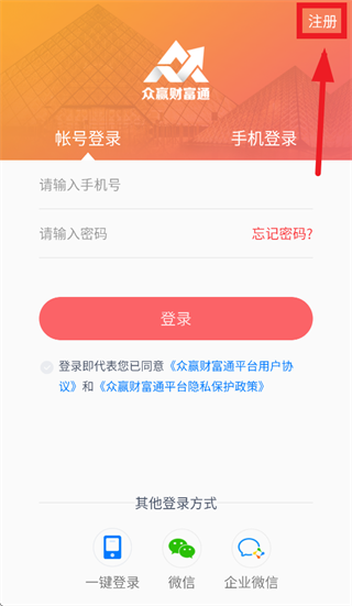 在注册界面输入推荐码,手机号,验证码,勾选注册即代表您已同意 《众赢财富通平台用户协议》和《众赢财富通平台隐私保护政策》,点击注册即可