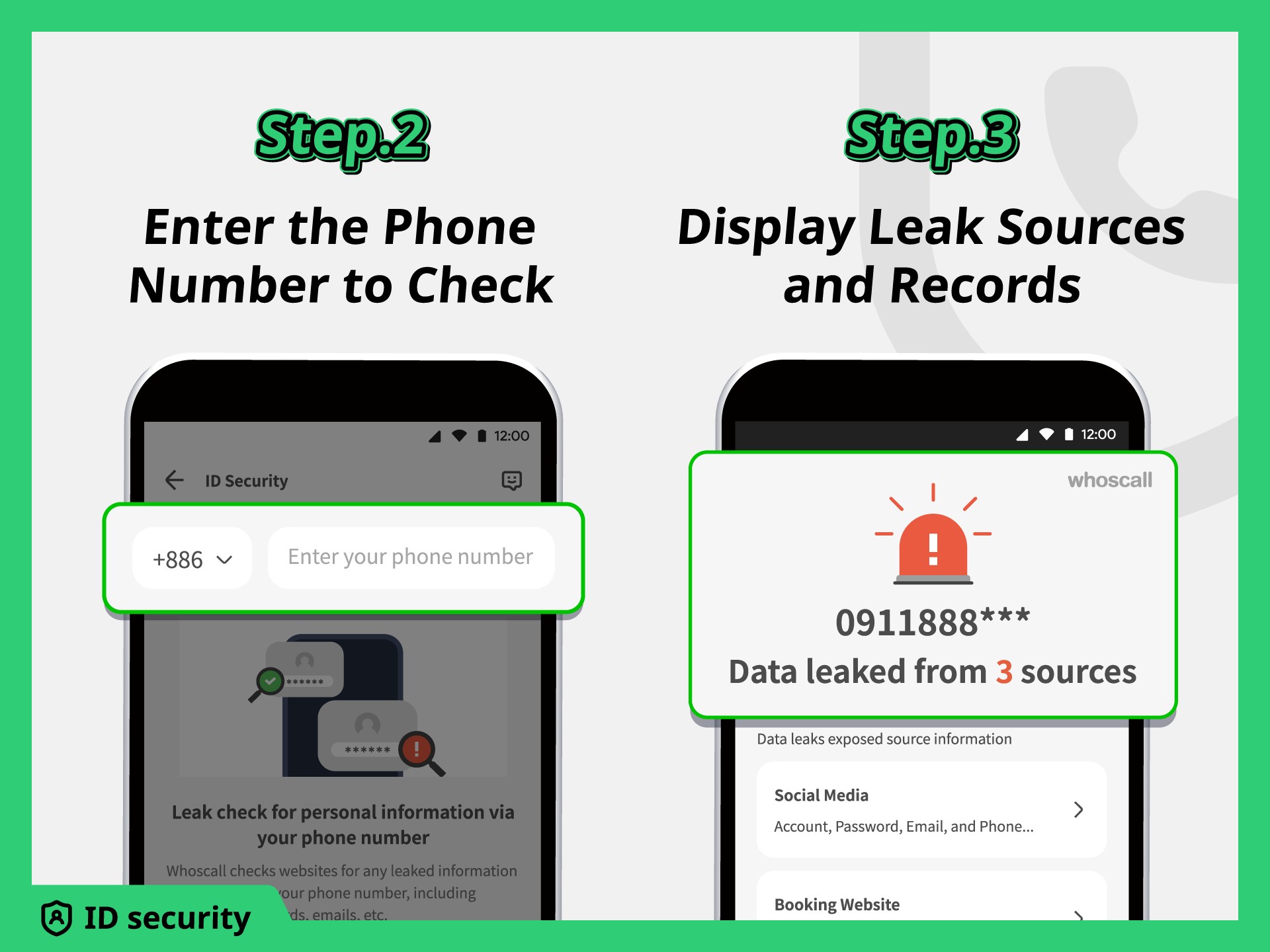 3、进入 “ID Security” 后,按照提示输入需要检查的电话号码或 email 电子邮件等个人信息,点击检查按钮,Whoscall会利用其数据库和技术手段,检测该信息是否存在外洩风险等情况,并显示相应的结果和提示。