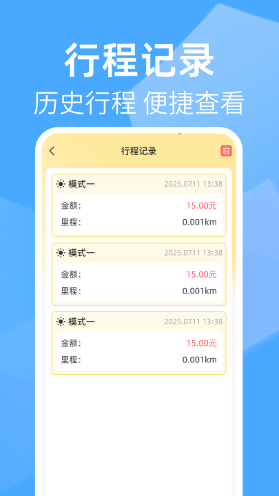 计价模式支持灵活设定起步价、计价时间段和里程价等多种计费规则,适应不同的计价需求。行程记录功能自动保存每一次出行详情,包括开始结束时间、里程和费用,让您的每一段旅程都有据可查。计价功能提供清晰透明的费用展示给乘客,增强信任度和服务满意度。