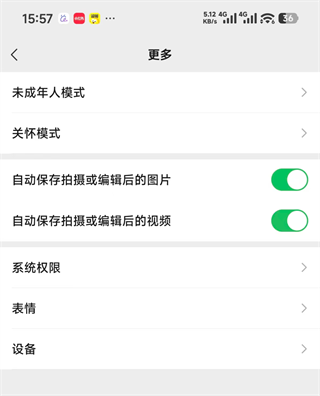 在本次的设置-- 更多里面新增了 自动保存拍摄或编辑后的图片/自动保存拍摄或编辑后的视频 开关,可以根据自己的需求进行设置。