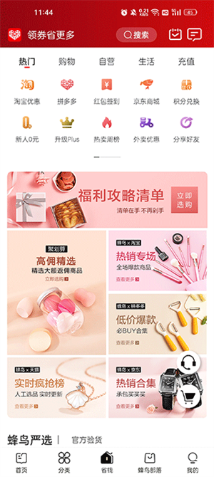 依托于各大电商平台,采用专利爆款+电商CPS+品牌直供的模式,为会员提供美妆个护、居家日用、数码家电、食品生鲜、服饰鞋包、海淘尖货等上万种正品货源,