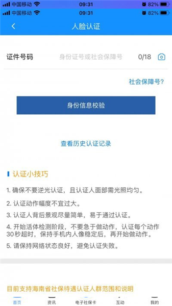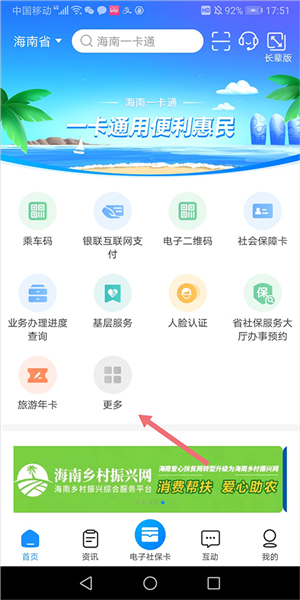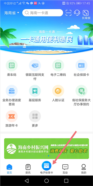 1、打开并登录海南人社app(即海南一卡通app),进入首页处点击【人脸识别】,按照上文简介完成认证。认证通过后再返回首页处点击底部【电子社保卡】(下图红色箭头所指)