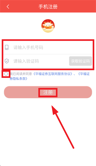 输入手机号,验证码,勾选我已阅读并同意 《华福证券互联网服务协议》、《华福证券隐私条款》,点击注册即可
