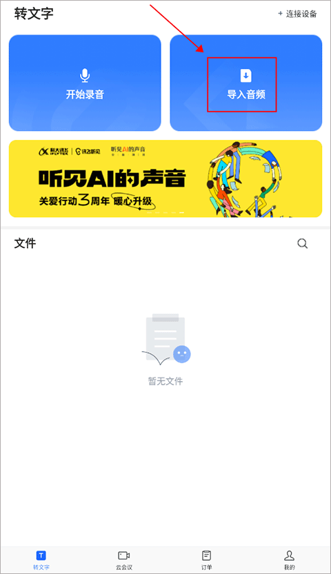 1、首先我们进入到讯飞听见app主界面之中,在转文字界面中点击选择“导入音频”。