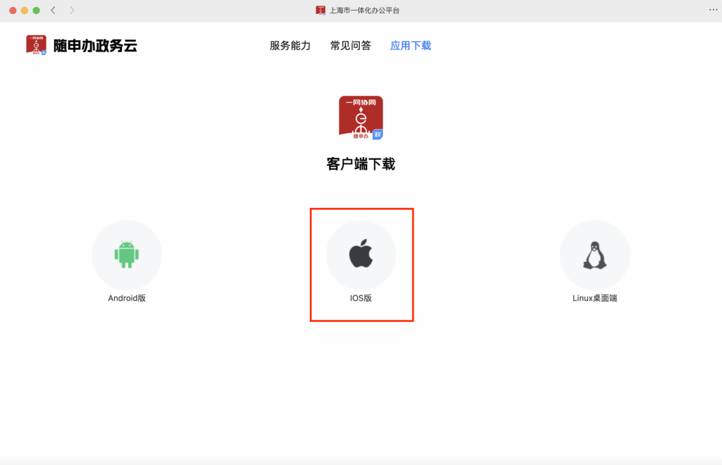 1. 访问以下网址:https://ywxt.sh.gov.cn/ramos_home/#/download 显示界面如下,点击“iOS 版”图标: