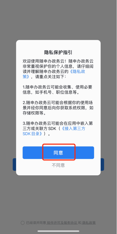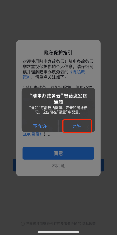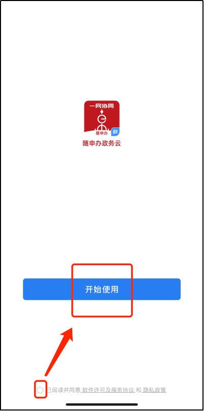 下载完毕后,点击随申办政务云图标进入 app,选择“允许”通知,然后选择“同意”隐私政策,勾选“已阅读”即可开始使用: