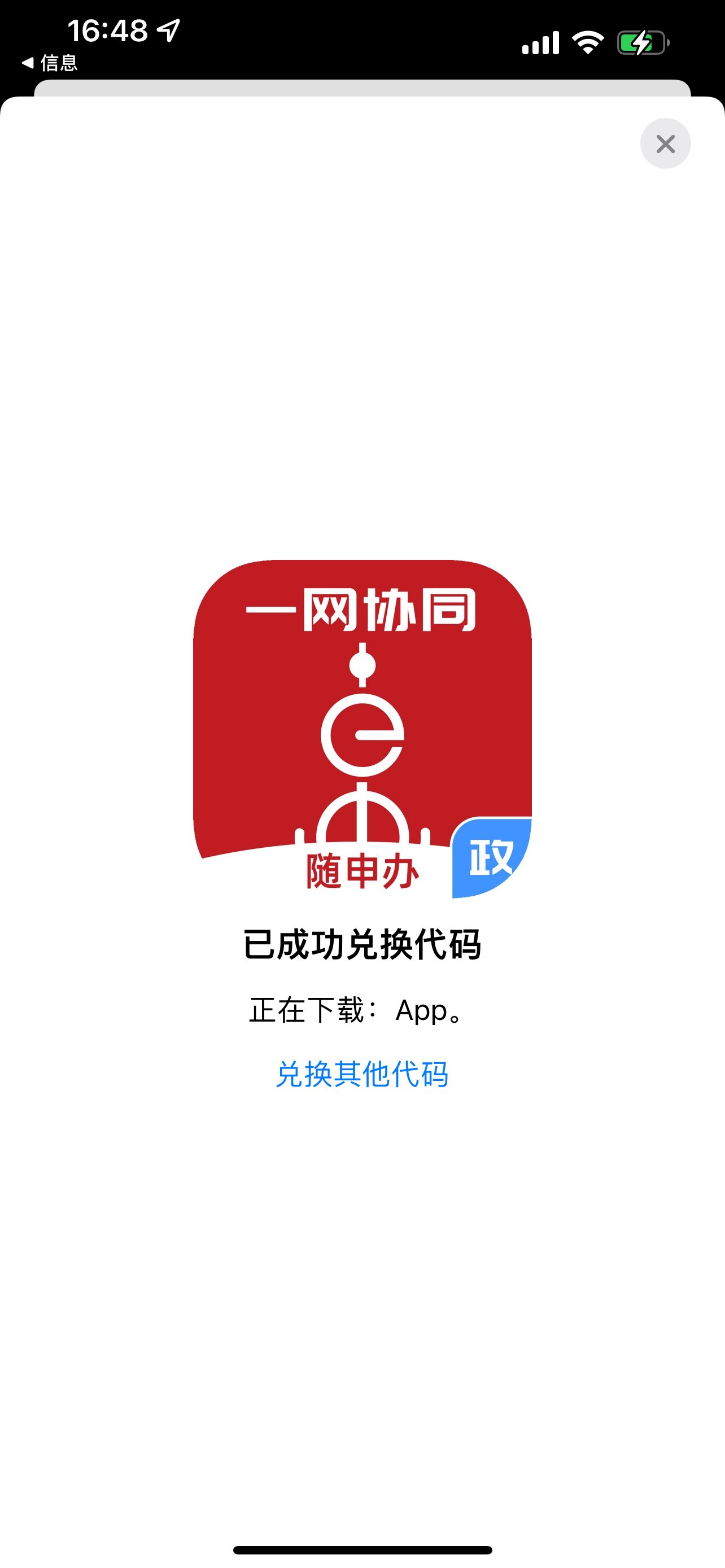 面容ID或Apple ID 的账号密码验证成功后界面如下左图,表示兑换成功,随申办政务云已在下载中,返回 iPhone主界面可看到载入进度: