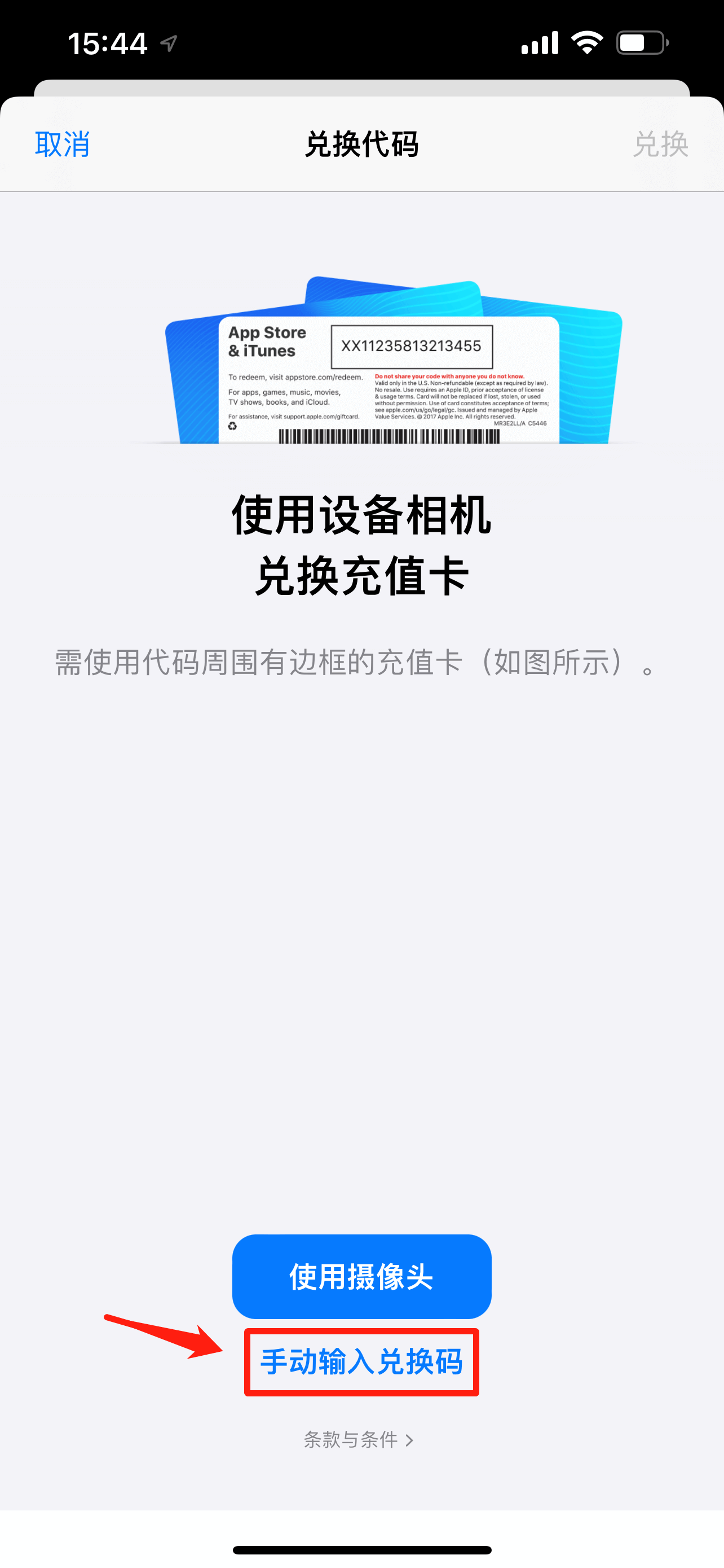 然后选择“手动输入兑换码”,在“代码”框中输入短信中的安装包