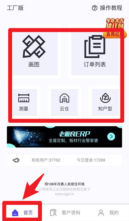 3、进入首页,可以看到画图、订单列表、测量、云仓和知户型等主要功能模块,点击即可快速使用。