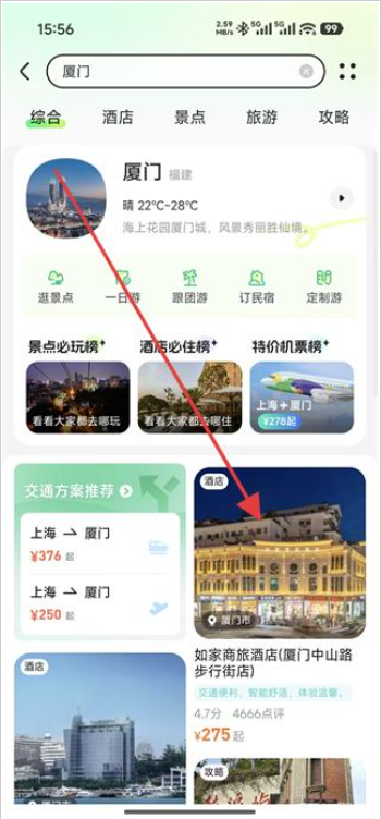 2、在厦门旅游信息页面,查看综合、酒店、景点等分类信息,选择如家商旅酒店厦门中山路步行街店,进入该酒店详情页面。