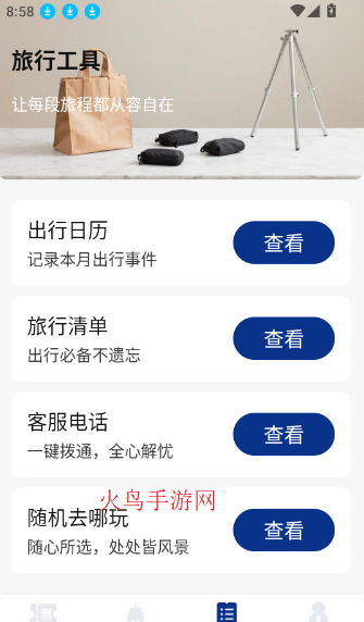 2、在软件首页的底部菜单栏中找到“旅行工具”功能按键来点击进入。