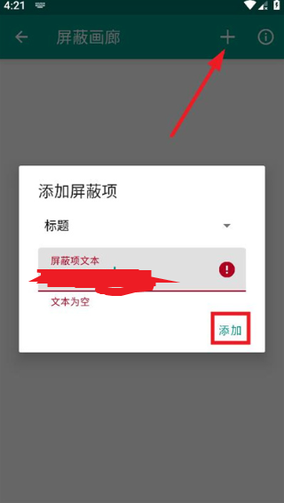 3.来到屏蔽画廊界面,点击右上角的【+】,接着你可以在输入栏内填写你要屏蔽的画廊名称后,点击【添加】即可。