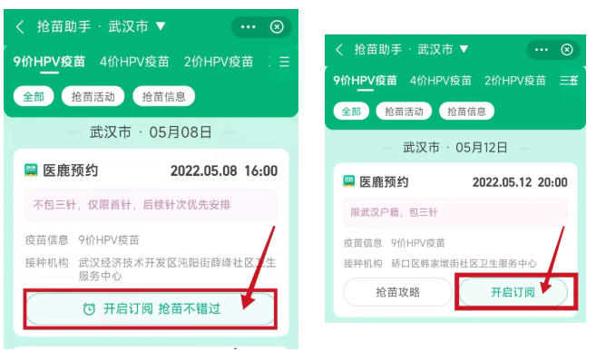 向下滑,找到需求场次,预约开放前,点击“开启订阅”,抢苗不错过!疫苗开放预约时,订阅按钮将变为预约入口,点击立即预约!