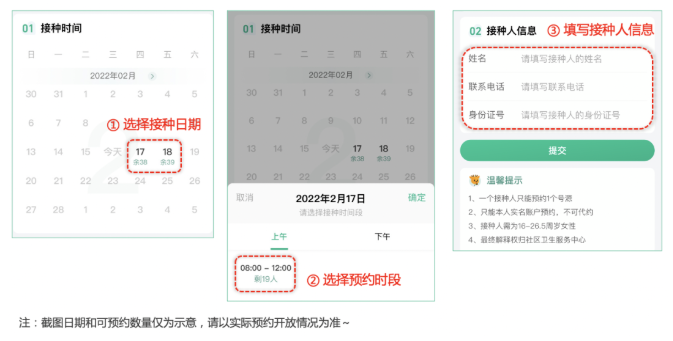 选择接种日期和时间,填写接种人信息,系统会在线核实是否符合疫苗接种条件,是否本人实名账户,只有符合条件的用户才可进行预约。