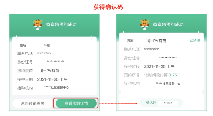 预约成功后,点击“查看预约详情”,将获得确认码,之后请携带相关证件,按预约时间准时前往接种点接种。