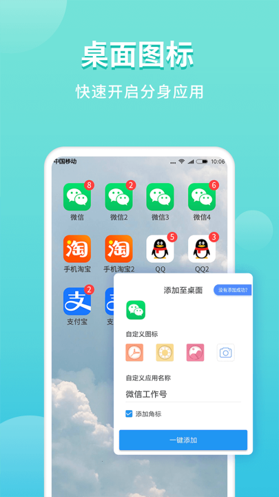 5、桌面分身:双开、多开、分身的微信、支付宝、快手、抖音等支持创建桌面快捷方式,分身放置桌面,开启更方便。