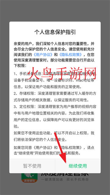 在本站下载深度清理管家app,打开,点击继续使用,进入app