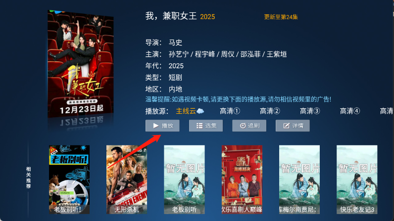 4、用户点击想看的影片进入详情页,点击播放。