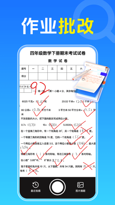 免费帮对作业app是一款集拍试卷、拍笔记、拍错题、试卷擦除、口算批改、文档扫描、文字识别、拍照翻译等功能于一体的智能扫描软件,可以帮助用户方便快速地扫描试卷、作业、笔记、错题等,是学生、家长、教师、培训机构等人员得学习、办公好助手。