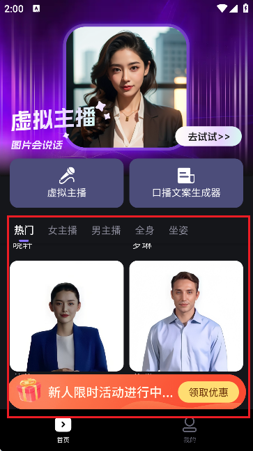 4、而且其中还提供诸多类型的虚拟主播模板,例如女主播、男主播、全身的、坐姿的