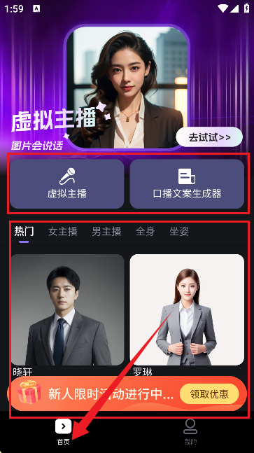 3、进入到软件首页,如图所示。这里提供了虚拟主播生成且和口播文案生成器两个功能入口。