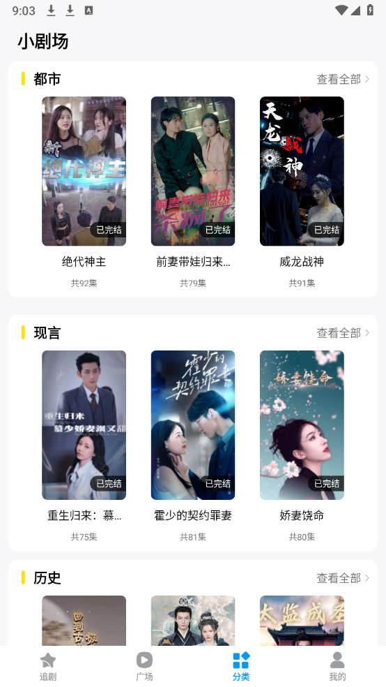 2、进入首页,有很多的短剧资源分类,包括都市、现言以及历史等类型。