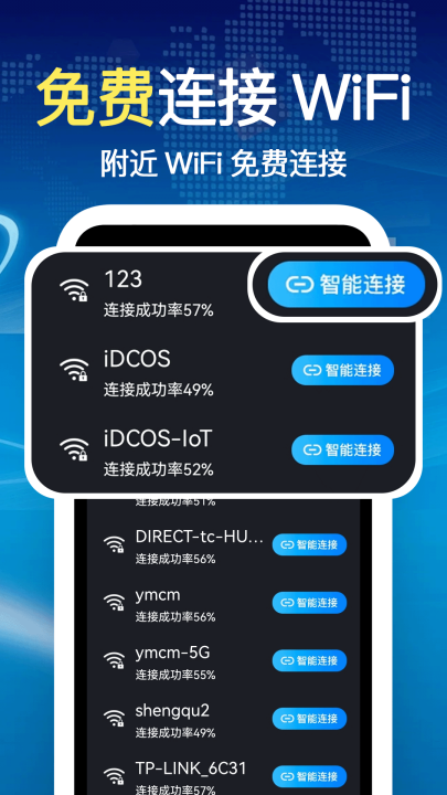 wifi万能智连钥匙软件v1.1.3 最新版wifi万能智连钥匙软件是一款网络连接类网速测试软件,此款软件专为有网络连接需求的用户打造。软件内为大家提供了大量好用的功能,在这里大家可以自由畅连周围的网络,十分好用。对wifi万能智连钥匙软件感兴趣的用户不要错过,欢迎大家在本站下载实用。