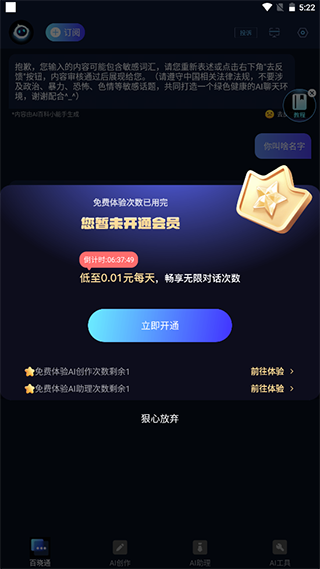 当然用户还是可以免费体验到一次应用的ai创作或ai助理等功能