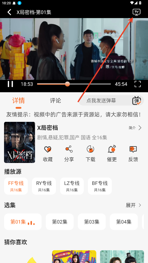 2.点击右上角TV投屏。