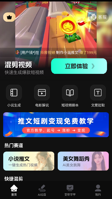 AI混剪视频是一款操作简单易上手的视频剪辑工具,拥有丰富的模板和素材库,可以帮助用户一键生成高质量小说推文视频。此外,我们还提供推文短剧变现免费教学,王牌导师团队在线进行专业指导,零基础小白也能让创作的内容迅速变现。