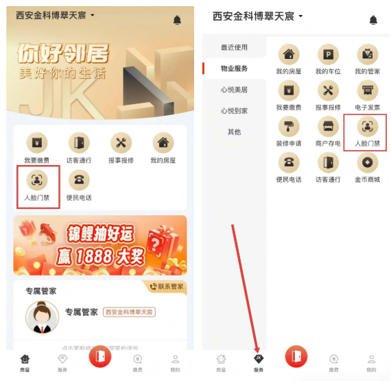手机下载”大社区“APP,首页点击”人脸门禁“入口或者首页点击”服务“ICON,在服务模块找到”人脸门禁“入口